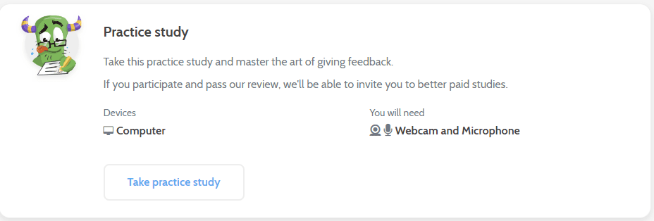 There will also be a practice study waiting for you, which requires your webcam and microphone. This is a free study (you won’t get paid for it) but it will unlock higher paid studies for you.