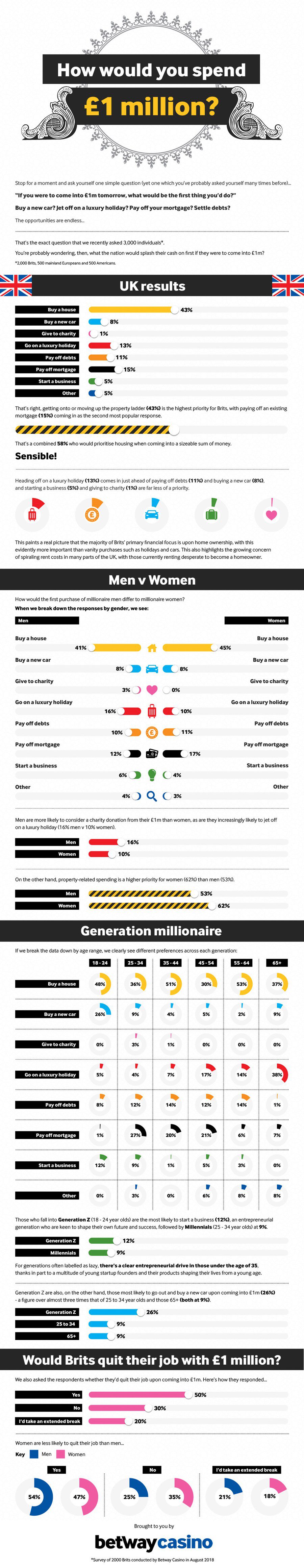 Whatever medium you operate in, there are ways to earn – and, if you’ve got the right amount of luck, skill and determination, earn a lot of money. For those that cross the seven-figure-threshold, a world of opportunities instantly becomes available. Now, whether eternal happiness is among those opportunities is up for debate. However, there are certainly plenty of ways you can spend a million. According to research by casino gaming site Betway, most people would buy a house. With gaming fans regularly presented with the opportunity to win $1 million+ jackpots, the answer is one they’ll have thought about a lot. Based on the responses of 3,000 individuals, the company found that 43% would invest their stash in a new property.