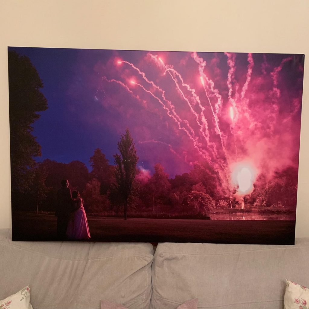 Not gonna lie, when I first opened up the canvas box I got choked up seeing the picture. I had chosen a photograph from our wedding – with fireworks going off to the right hand side, and Tony and I tucked into the left hand side – Tony behind me and us both gazing up at the fireworks.
