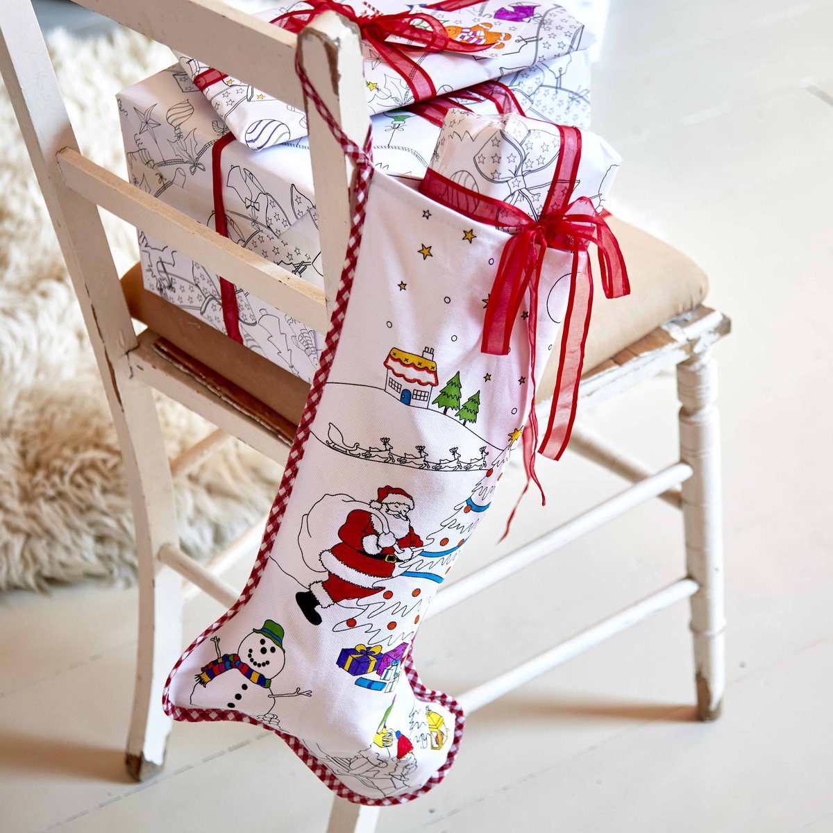 a Colour-in Christmas Stocking with wash-out pens; Featuring all your favourite festive motifs including gingerbread men, candy canes, baubles, reindeer, Christmas trees, stockings and lots more to colour-in and personalise AND with space for kids to write their wishlist for Father Christmas! Because the ink completely disappears on a machine wash, you can begin a new family tradition to enjoy year after year!