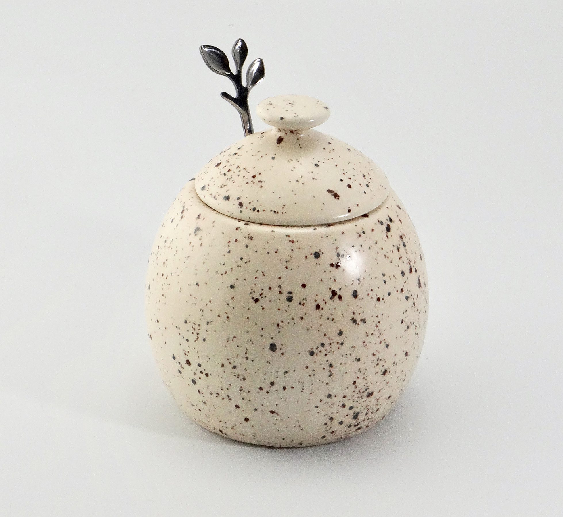A lovely handmade ceramic sugar bowl with lid and a stainless steel leafy spoon finished in a unique honey speckle glaze created by master craftsman Peter Bowen in his pottery studio in the Somerset countryside.
